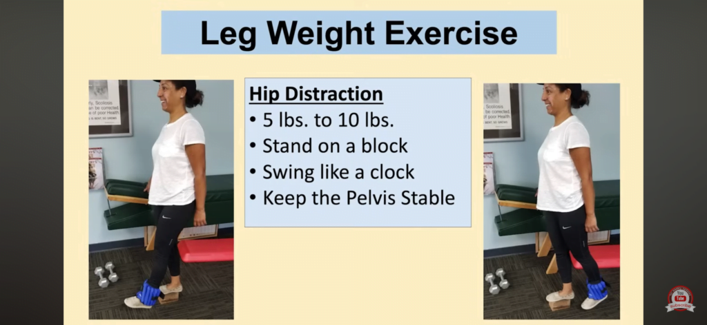 Man behöver då sitt bäckenbälte och en tyngd man kan spänna åt runt foten. Denna behöver vara såpass tung att du känner att höftleden öppnar sig lite när benet hänger fritt i luften. Stå i en trappa eller på en steppbräda på benet du inte skal träna. Du kommer bli trött i höften du står på, så det kan vara bra ha något att stödja sig på, sen är det bara att låta tyngdkraften göra sitt och låta benet pendla fram och tillbaka helt passivt. En halvtimme per dag, och gärna båda benen. Om du på något sätt kan få värme på i tillägg så har du skapat en mycket bra miljö för att leden skal få in näring. Titta vad glad man blir när man gör övningen